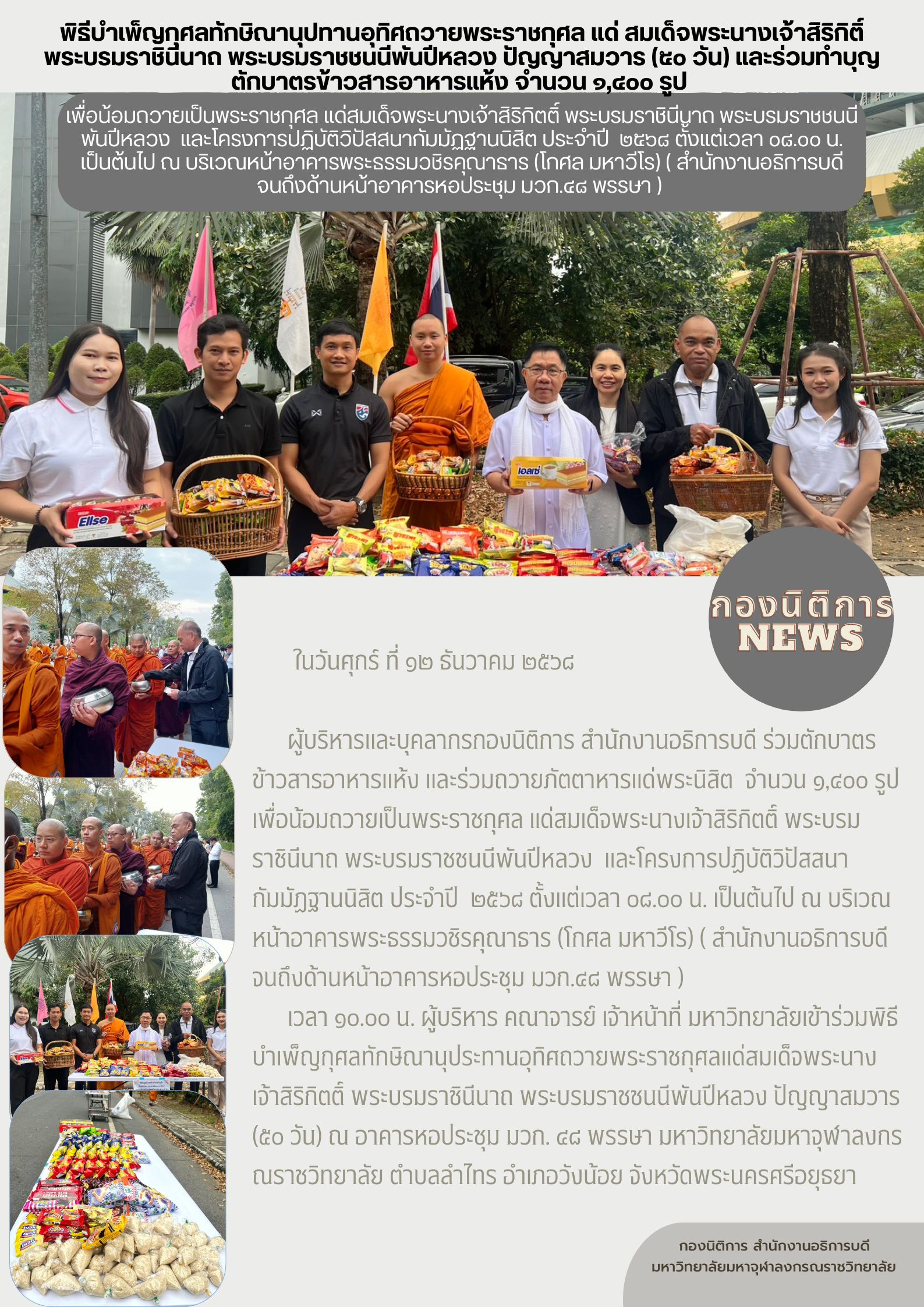 พิธีบำเพ็ญกุศลทักษิณานุปทานอุทิศถวายพระราชกุศล แด่ สมเด็จพระนางเจ้าสิริกิติ์พระบรมราชินีนาถ พระบรมราชชนนีพันปีหลวง ปัญญาสมวาร (๕๐ วัน) และร่วมทำบุญตักบาตรข้าวสารอาหารแห้ง โครงการปฏิบัติวิปัสสนากัมมัฏฐานนิสิต ประจำปี ๒๕๖๘ จำนวน ๑,๔๐๐ รูป